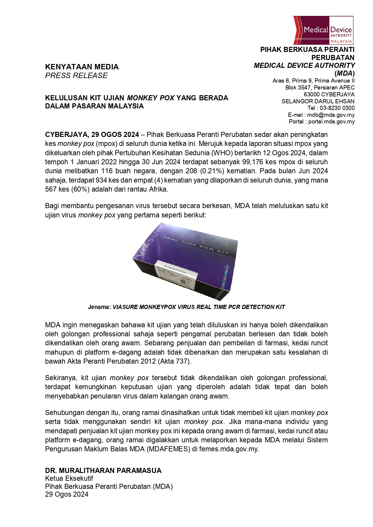 KENYATAAN MEDIA: KELULUSAN KIT UJIAN MONKEY POX YANG BERADA DALAM PASARAN MALAYSIA