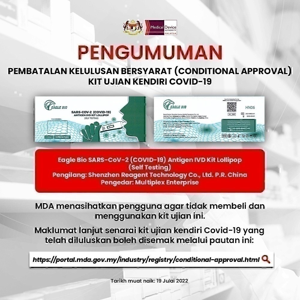 Pembatalan ini dibuat kerana establismen tersebut telah gagal mematuhi syarat kelulusan yang diberikan oleh MDA dan berkuat kuasa SERTA-MERTA. MDA juga ingin menasihatkan pengguna agar tidak membeli atau menggunakan kit ujian kendiri Covid-19 yang tidak mematuhi keperluan MDA kerana dikhuatiri tidak selamat untuk digunakan.