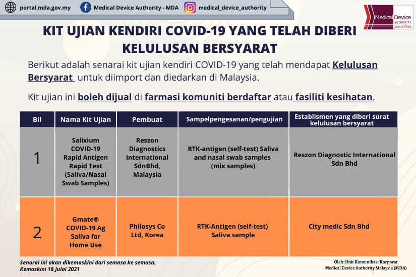 Kit Ujian Kendiri Covid-19 Yang Telah Diberi Kelulusan Bersyarat Kemaskini 18 Julai 2021