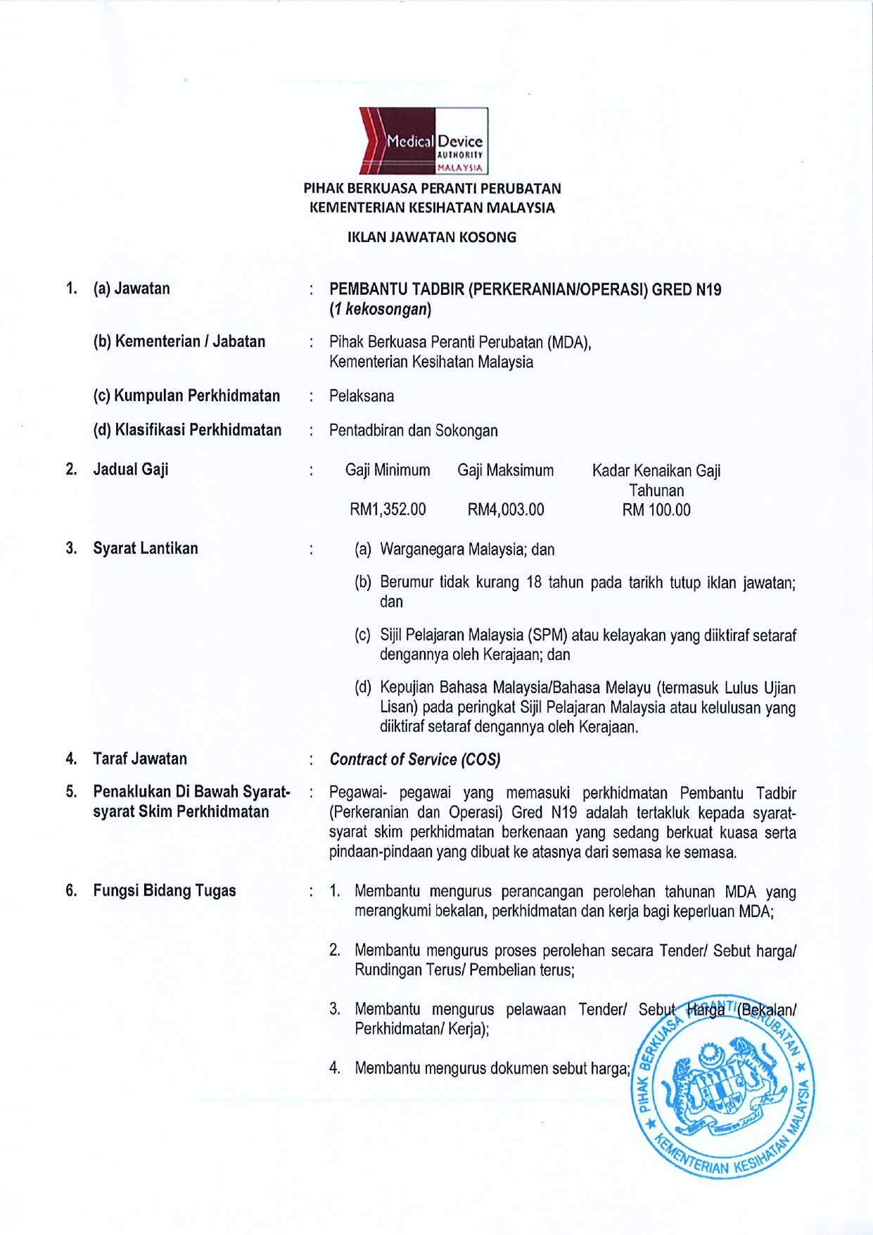 IKLAN JAWATAN PEMBANTU TADBIR (PERKERANIAN DAN OPERASI) GRED N19 (Contract of Service)