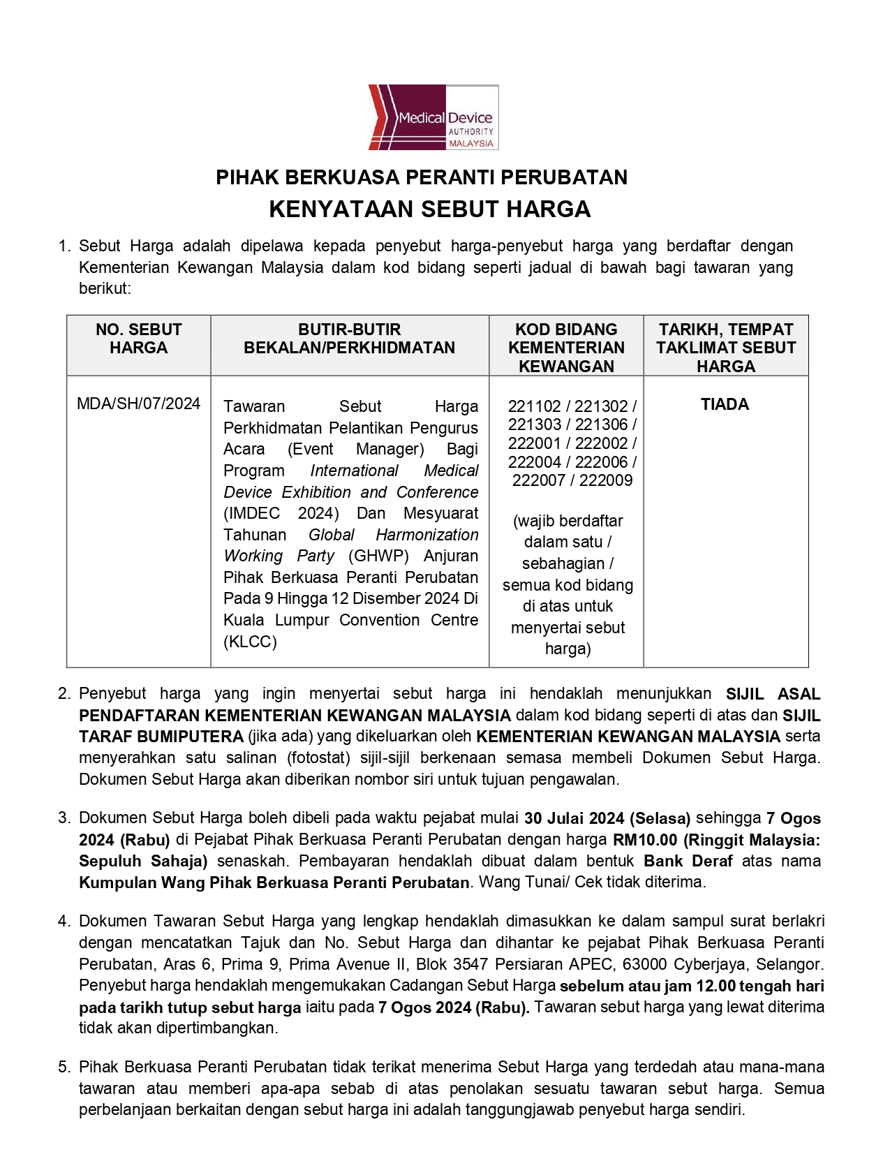 PELAWAAN SEBUT HARGA PERKHIDMATAN PELANTIKAN PENGURUS ACARA (EVENT MANAGER) BAGI PROGRAM IMDEC 2024 DAN MESYUARAT TAHUNAN GHWP